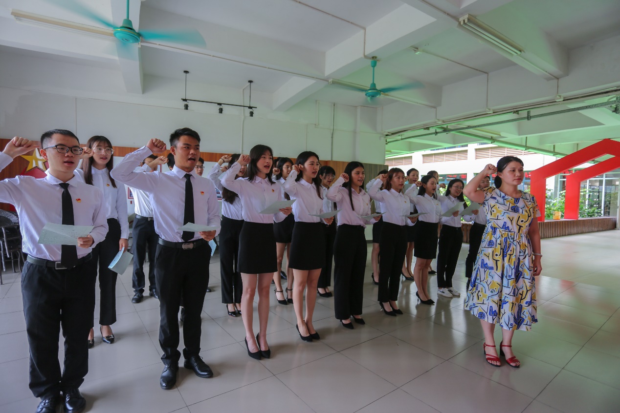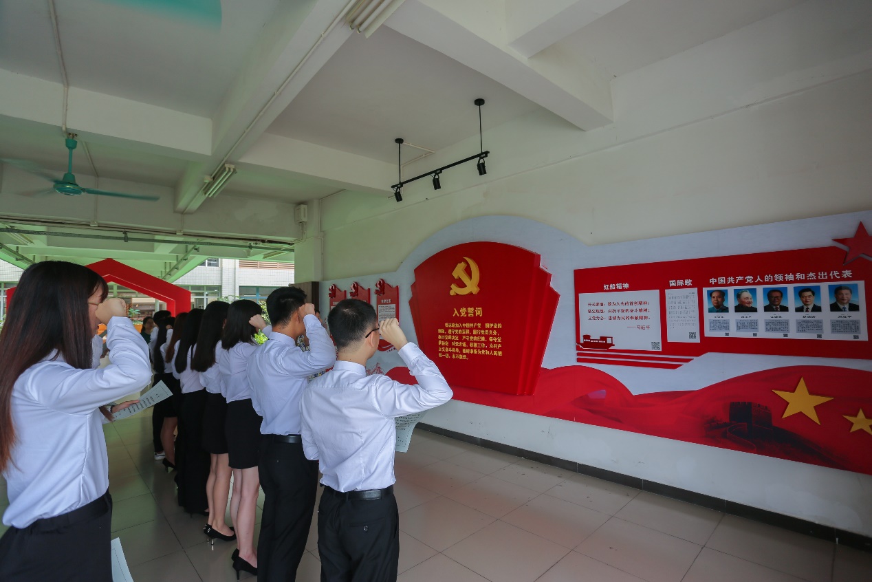 6月17日中午,信息工程与商务管理学院党总支学生党支部在清远校区党员活动中心组织新党员宣誓仪式,此次宣誓由学生党支部书记章小剑领誓。同志们庄重的佩戴起党徽,面对鲜红的党旗,高举右手庄重宣誓,表达了为党的事业奋斗终身的决心。