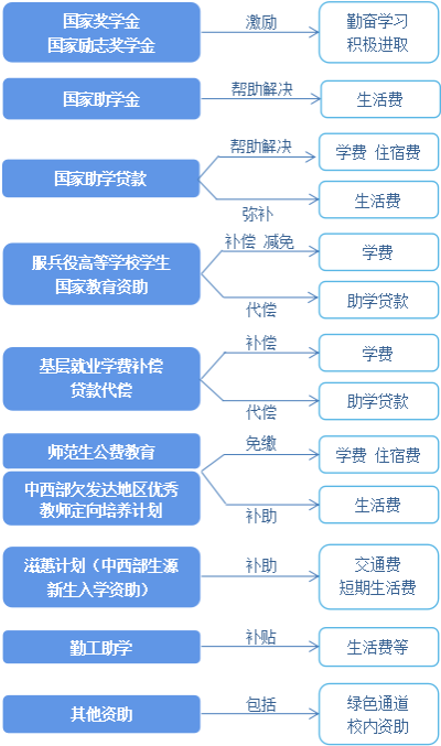 国家在高等教育本专科阶段建立起国家奖学金、国家励志奖学金、国家助学金、国家助学贷款等多种形式有机结合的高校学生资助政策体系。