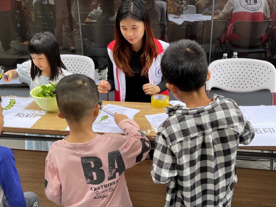图3 我院志愿者指导小朋友进行植物拓印制作