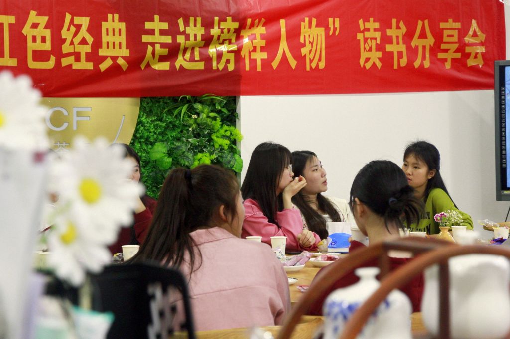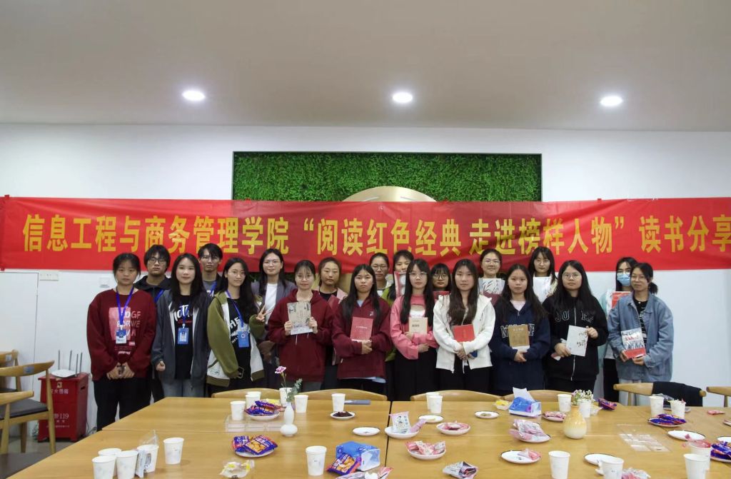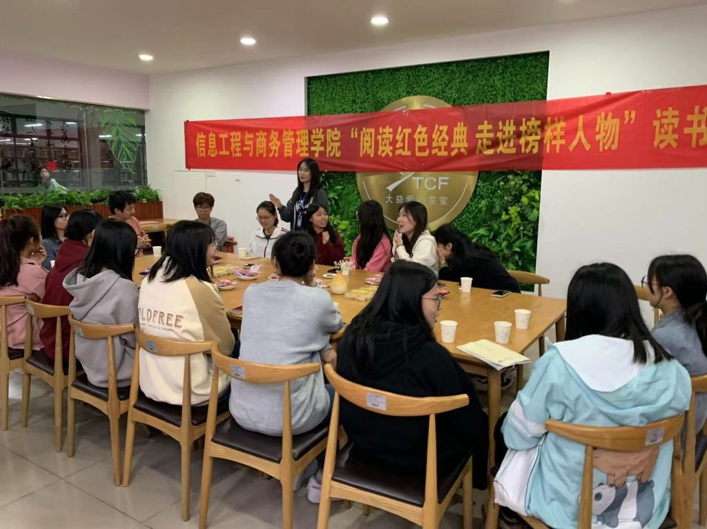 阅读启智,青年强国。重温红色经典,追忆峥嵘岁月。在中国革命、建设、改革和发展的历程中,涌现出了数不胜数的杰出人物,他们引领着时代前进的步伐,留下了不可磨灭的足迹。更好贯彻党的二十大精神和教育方针,落实立德树人的根本任务,倡导阅读红色经典文化图书,培养我院学子对榜样人物传记的阅读兴趣,继承发扬伟大建党精神、长征精神等精神谱系,信息工程与商务管理学院在4月25日晚上在图书馆二楼大益茶室举办“阅读红色经典,走进榜样人物”红色故事分享会。参加本次分享会的有学院团委老师周丹丽以及14名的信商学院读者。