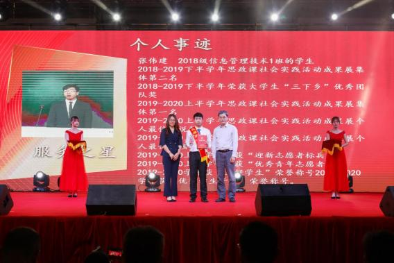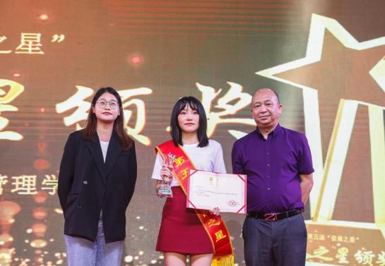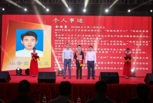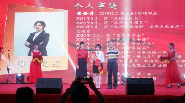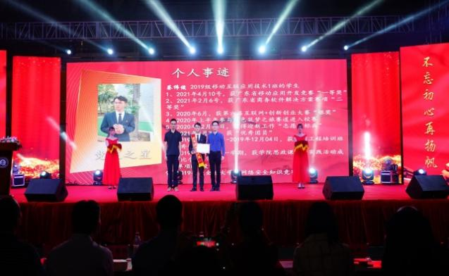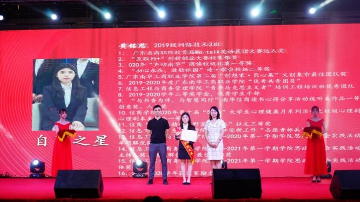 紧接着的是颁奖环节,分别由肖伟常务副院长和英德市总工会廖宇红副主席,余喜文院长和英德市茶业行业协会罗淑贤秘书长,邱州鹏主任和五一劳模王原鹏老师,凌红副处长和广州融创文旅城市场部翟华福经理,刘杰副院长和广州粤嵌通信科技股份有限公司姚文婷主管,杨家成副院长和大参林医药集团股份有限公司清远地区饶水群经理,郑海清常务副书记和广州创显科教股份有限公司王黠经理,1988文创直播基地胡小华总经理和广州贝壳科技服务有限公司校园招聘部张锦辉经理为智慧之星、最美讲解员、竞技之星、自强之星、团队之星、服务之星、社会实践之星、才艺之星这些新时代中的“弄潮儿”进行颁奖。每个奖项的获奖者背后都付出了他们勤劳的汗水,用实际的行动来实现或追求他们的梦想,赢得了现场接连不断的热烈掌声,同学们纷纷送上自己最真挚的祝福。