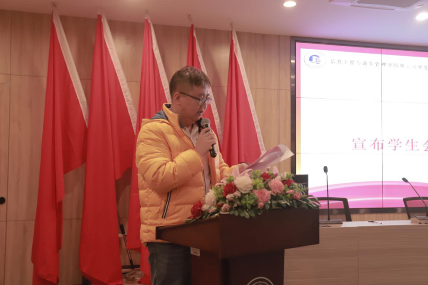 在大会的第四次全体会议上,首先,陈卫强老师宣读学生会新一届主席团得票情况和选举结果。随后,龙俏颖老师宣读《关于工作报告的决议》。接着,新一届学生会主席团成员代表上台领读《关于学联学生会工作人员改进作风服务同学的若干规定》。
