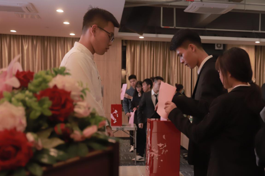接着,进行大会的第二次全体会议。大会通过了《选举办法(草案)》和大会总监票人、监票人和计票人名单后,11名委员候选人有条不紊地进行各自的演讲,每位候选人声情并茂、慷慨激昂展示自身的良好素质和希望继续留在学生会为老师和同学服务的热切愿望。演讲结束后,由工作人员清点人数,总监票人陈卫强老师向学生代表展示密封好的选票,随后计票人发放选票。随后,全体学生代表进行投票并把选票有序地投进计票箱内。经票数统计,陈卫强老师宣布学生会委员选举结果,并对9名委员的当选表示祝贺。