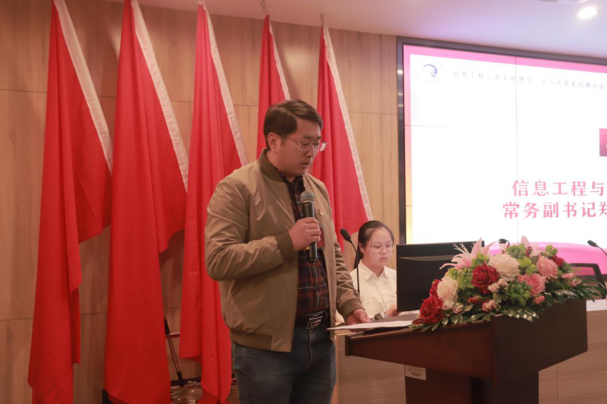 紧接着,学院党总支常务副书记郑海清老师讲话,郑海清常务副书记代表学院党总支向大会的召开表示热烈的祝贺,肯定了学生会在过去一年来的工作,同时对学生干部提出三点希望:第一、进一步树立良好的学风和作风,团结一致、引导、带领广大青年和学生紧密围绕学院党总支的中心工作,奋发有为;第二、注重自身能力和素质的提升,严于律已,在广大青年学生中树立好的榜样;第三、以广大青年学生成长成才的需要规划、组织学生活动,广泛开展丰富多彩的校园文化活动。