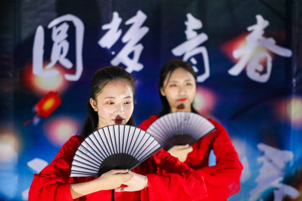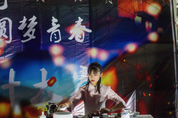 然后是舞蹈表演《棠梨煎雪》,曼妙的舞姿,轻柔的舞蹈引起全场气氛的高潮。接下来,评委老师走出评委席,走到作品区赏花灯、评分;随后,由大益爱心茶室带来的茶艺表演《大益八式》;紧接着就是小品表演,有趣的演出和精彩的剧情,使全场观众开怀大笑;活动最后一个节目,是大合唱《如果有来生》,校园内萦绕着优美的旋律和动人的歌声。