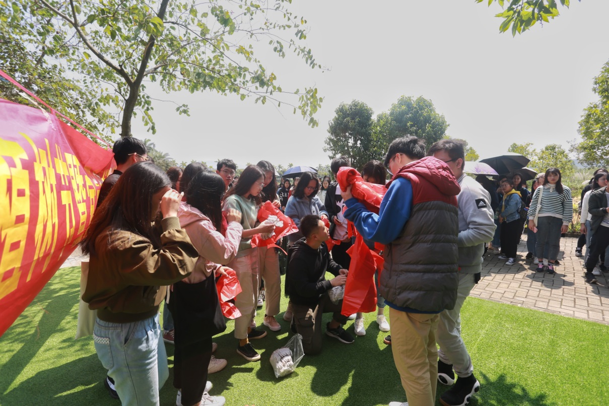 在活动开始前,负责本次活动的工作人员已将活动物资运到了图书馆等候同学们的到来。参与人员与工作人员集合完毕后,便由崔宁老师进行动员指导,崔宁老师强调“首先,希望同学们能够重视本次植树节暨双学活动,以小见大,从思想和行动上认真学习并吸收党的基本理论知识,从小事上一点一滴了解国家的创新发展理念;其次,同学们在整个活动的过程中要注意安全,防止发生任何安全风险”。接着,工作人员将活动所需工具分发到双学小组的各个组长中,由组长分发下去并分配各自任务,本次活动共有双学小组33组,1至15组负责紫荆林区域,其余小组则负责7栋宿舍区域。活动进行过程中,同学们仔细寻找草地垃圾,互相帮忙,松土施肥,使负责区域的环境变得焕然一新、绿意盎然、生机勃勃;最后,同学们将各自工作完成后,看着环境的改善露出了欣慰的笑容,有些同学还把自己的劳动成果使用相机记录下来,在同学们的欢声笑语中,本次活动圆满落下帷幕!