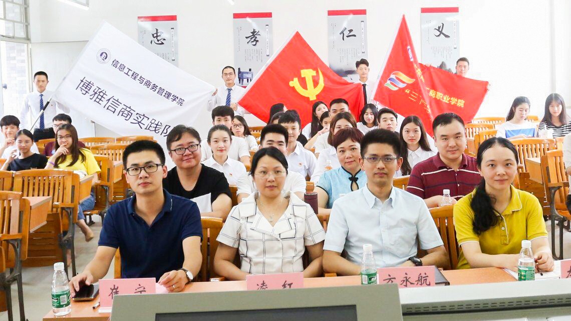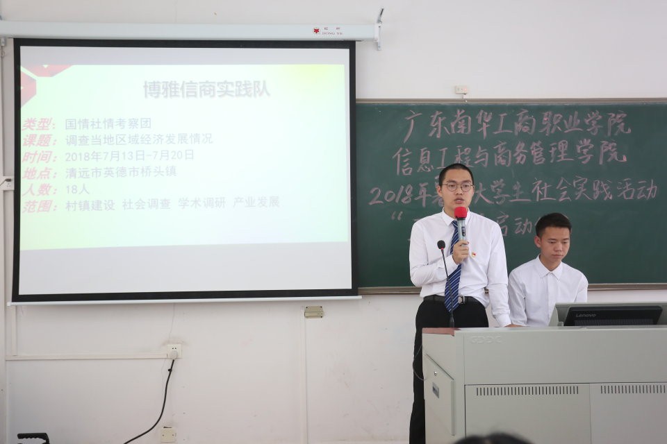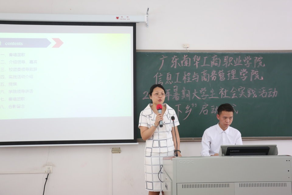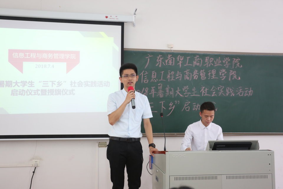 随着庄严的国歌会议拉开了帷幕,由主持人邱洁标介绍本次出席大会的嘉宾,他们分别是校团委副书记方永航老师、信息工程与商务管理学院党总支副书记凌红老师、信息工程与商务管理学院团委书记崔宁老师、信息工程与商务管理学院团委副书记龙俏颖老师、信息工程与商务管理学院辅导员老师陈清嫦老师、陈卫强老师、赖志聪老师、王奕老师。首先由校团委副书记方永航老师上台讲话,方永航老师先对这次会议的及时举办表示赞赏,其次对接下来的“三下乡”活动注意事项进行嘱咐,要求熟记指导手册,面对突发状况冷静应对,然后在活动中队员要发扬艰苦奋斗、吃苦耐劳的精神,利用新媒体做好宣传报道,最后预祝队伍可以取得圆满成功。接着由信息工程与商务管理学院2018年暑期大学生“三下乡”社会实践博雅信商实践队队长梁景滔同学作本次活动介绍,他先是对团队进行了介绍,再对项目进行详细介绍,本次项目有两个,一个是调研,另一个是对社会主义核心价值观进行宣传;其中调研项目有三个调查问卷,价值观宣传两个文化建设活动,活动的日程安排也是很满,希望能达到预期的为当地发展区域经济带动群众脱贫工作建言献策并提供一定数据支持的效果,通过这次实践活动能有效提高大学生发现问题和解决问题的能力。
