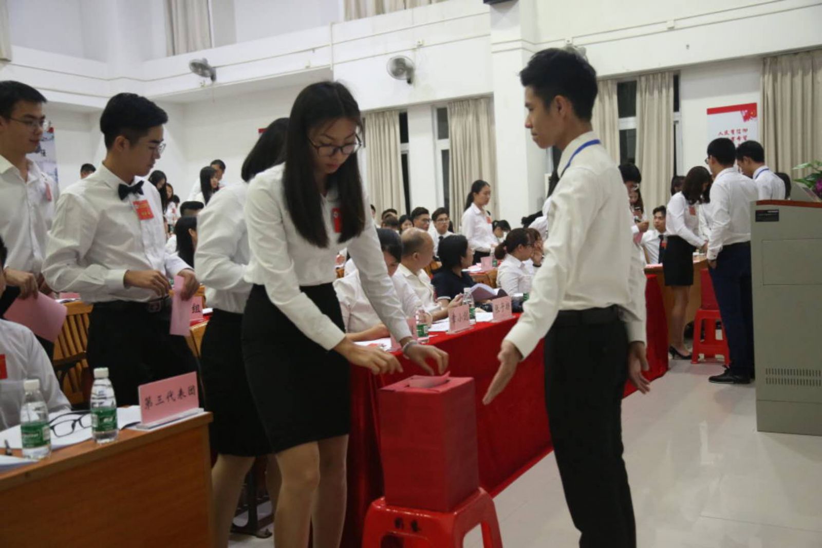 报告结束后,各代表团以及代表团团长分组讨论并审议院学生会工作报告,审议通过了《广东南华工商职业学院信息工程与商务管理学生会章程》并讨论新一届学生会委员候选人。接着委员候选人进行演讲,在通过大会选举的办法以及大会总监票人、监票人和计票人名单后,委员候选人有条不紊地进行各自的演讲,每位候选人声情并茂、慷慨激昂展示自身的良好素质和希望继续留在学生会为老师和同学服务的热切愿望。演讲结束后,由工作人员清点人数,总监票人龙俏颖老师计发选票,全体代表进行投票并把选票有序地投进计票箱内。经票数统计,由信商学院崔宁老师宣布学生会委员选举结果,并对以上委员的当选表示祝贺。随后,大会顺利通过了《关于信息工程与商务管理学院第二届学生会工作报告的决议》和《广东南华工商职业学院信息工程与商务管理学院学生会章程》。
