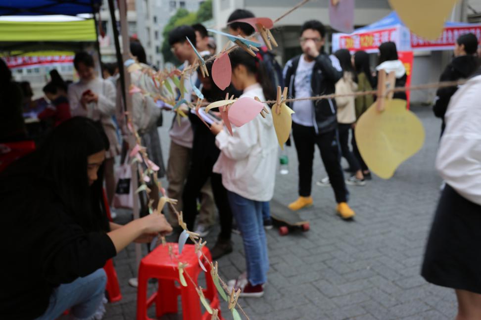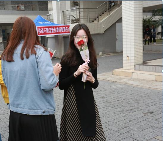 在活动开始之际,便有许多同学踊跃参与其中,现场气氛也开始慢慢活跃起来,在游戏环节中还设有多种形。首先在互赠温馨卡片环节,同学们将自己喜欢的卡片挑出写下自己想说的话寄存在工作人员处,待晚上统一由工作人员送出卡片;午时放学,现场气氛越来越热烈,中午12点—13点时间段穿裙子的女生在参加了活动之余还获得精致玫瑰花一朵,并和工作人员一起拍照留念。此外很多同学还用便签写下自己的心愿并留下自己的联系方式,放在指定区域内,经过许愿墙的同学如果觉得自己可以帮她实现的,可以揭下,联系该女生,帮助实现愿望!最后,无论男女同学都可以拿一张信纸和一个信封回宿舍写一封最想给他或者她的信,在活动结束前,交给工作人员,等活动结束后统一由信商团学干事送达。本次活动于3月7日下午5点圆满结束,