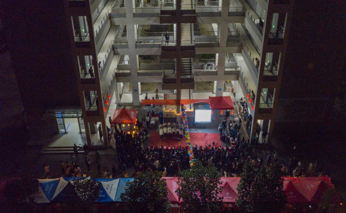 活动伊始,由主持人李健、肖锐妮介绍了到场的评委嘉宾,接着由崔宁老师致辞,他指出,非常感谢同学们积极参与本次活动,希望通过本次活动能够进一步激发同学们的创作热情,为南华的夜晚增添魅力,通过花灯照亮美丽的南华,也照亮每一位参赛者的人生梦想;接下来由信商艺术团合唱队带来表演《阳光路上》,表演结束后,各位评委老师到各个选手的花灯面前进行现场打分,在评委打分过程中,同学们都热情地介绍了自己的花灯过程、理念和创意,评委老师们也认真的给予评分;活动现场,花灯歌舞、茶艺等节目精彩纷呈,展现了中国非物质文化花灯的俊美神秘,传达了党的十九大精神,诉说着在中国共产党的领导下,社会生活发生的点滴变化,描绘了莘莘学子热爱校园和对科学探索的精神画面;接着,由陈华老师为此次活动做总结,陈华老师说到:“此刻灯美茶美人更美,同学们对灯的文化,茶的文化有深刻的理解,现场花灯展现了同学们的环保创新意识,希望同学们能够继续把这种积极向上的精神做到得更好”;最后由主持人公布获奖作品并由评委老师对获奖团队进行了颁奖。