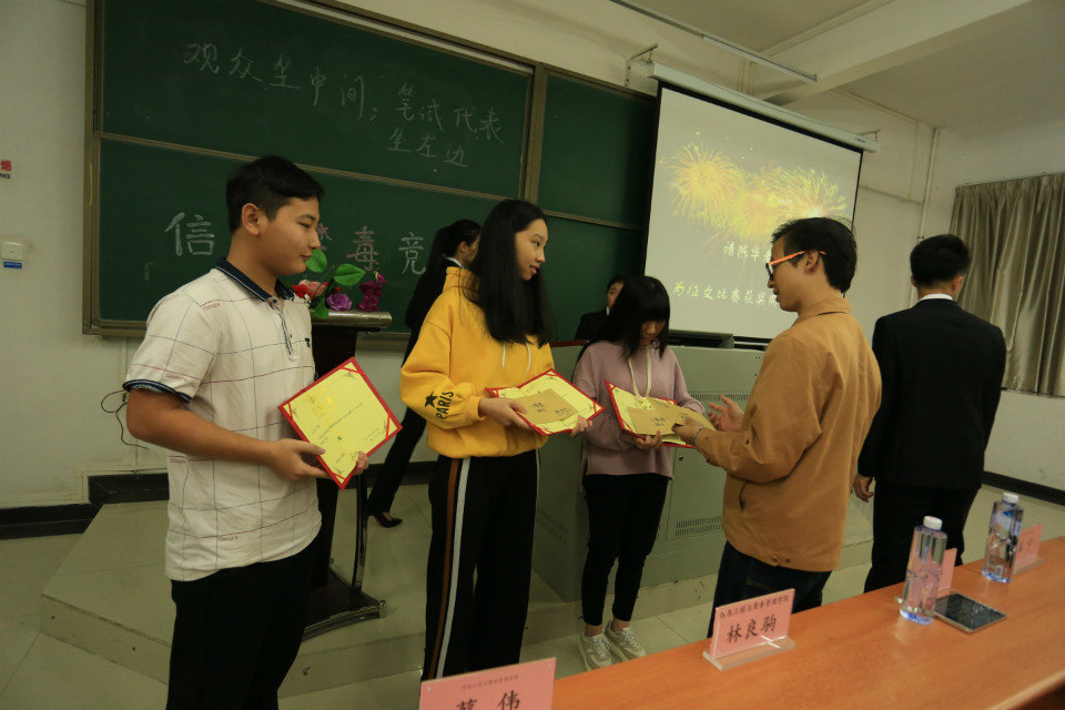 在“禁毒”知识竞赛进行的过程中,为保证评分审核工作的严谨性,同时缓解参赛选手的压力,在工作人员进行评分期间,全场观众与嘉宾一起观看了两部关于禁毒危害的视频,全场充满欢声笑语,同时又让大家深刻了解了毒品的危害性,丰富了学生们的“禁毒”意识;接着,进入比赛的第二轮抢答环节,由晋级班级中的未参加笔试的同学进行抢答,参赛现场中参赛选手们十分认真、积极的进行抢答题目,充分体现了同学们对“禁毒”知识的熟悉,活动接近尾声时,主持人公布了比赛最终获奖的班级,他们分别是:16级网络3班,16级工商4班,17级移动1班,由崔宁老师为比赛获奖的班级进行颁奖。最后由陈华老师为本次活动做总结发言,陈华老师提到:此次活动举办的很有意义,让同学么更进一步了解了毒品的相关知识以及危害,促进了大家共同做到“远离毒品,热爱生活”的活动目标。