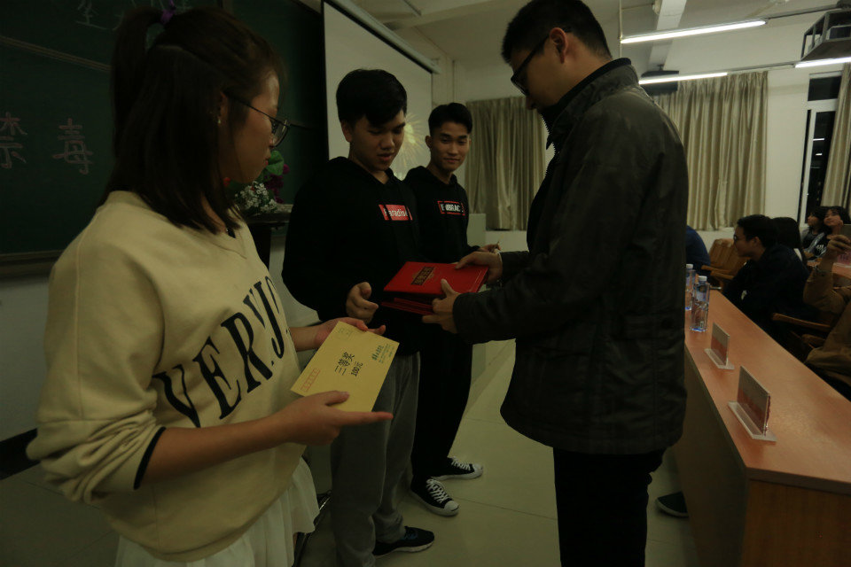为响应学校禁毒宣传,认真落实上级有关指导精神,加强宣传禁毒教育的力度,提高全体师生防毒、拒毒、禁毒的意识,营造良好的校园禁毒氛围,打造优秀的校园文化,传递正能量。由广东南华工商职业学院学生处主办,信息工程与商务管理学院承办的禁毒知识竞赛活动于2017年11月30日晚19点30分在清远校区教学楼319课室顺利展开。此次活动主题为“一起参与五个一构建和谐校园”,出席本次活动的嘉宾有信商学院陈华老师、崔宁老师,信商学院团总支副书记梁景滔同学、学生会副主席邹晓芳同学以及信商团学各部门部长。
