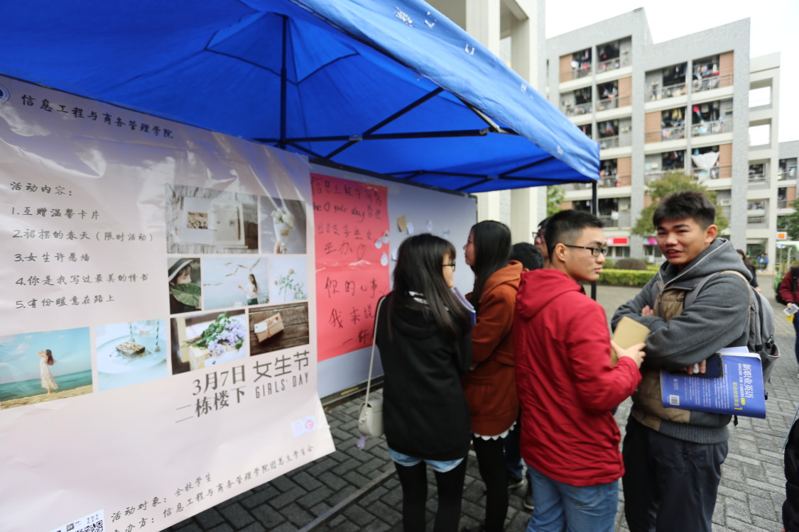 为了展示南华女生的独特魅力,促进学校男女同学之间的交流,进一步丰富校园文化生活,2016年3月7日上午信息工程与商务学院团总支学生会在学生宿舍2栋楼下举行了一场别开生面的女生节活动。