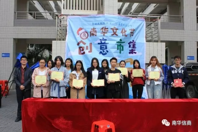 为进一步贯彻落实“一线定位、博雅教育”办学理念,发挥校园文化的育人、塑人功能,展现积极向上、奋发成才的精神风貌;为进一步促进大学生的全面发展,追随时代青春的脚步,满足同学追求时尚、新奇、创意的心理,展现新一代大学生的个性、想象力、创新能力、动手能力;由南华文化节组委会主办,各社团二级院系团总支学生会协办,信息工程与商务管理学院团总支学生会承办的“首届创意市集”活动于12月23日中午在清远校区2栋宿舍楼下隆重举行开摊仪式与颁奖仪式。担任本次创意作品打分的评委分别是财金学院杨力铖老师、张蒙老师,法公系邱伟波老师、张文娟老师,旅游系黄隽老师、熊汝鑫老师,信商学院章小剑老师、赖志聪老师。