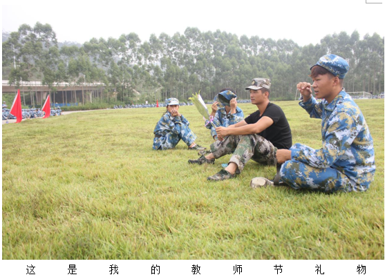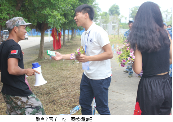 这一天,信商团总支学生会学生干部给大学新生的第一个老师送上鲜花和喉润糖。对于刚步入大学校园的新生,来到陌生的环境,没有家长在身边的陪伴,一下子失去了方向。在军训的这些日子里,“魔鬼”似的教官让他们明白命令就是要绝对的服从,不需要任何的借口跟理由的存在。这样看似“不尽人情”训练但却给了新生精神上的引导和支持,让他们受到熏陶和影响。即使是烈日下辛苦的操练,偶尔严厉的呵斥,新生们依然不减对教官这份的尊重与感激。