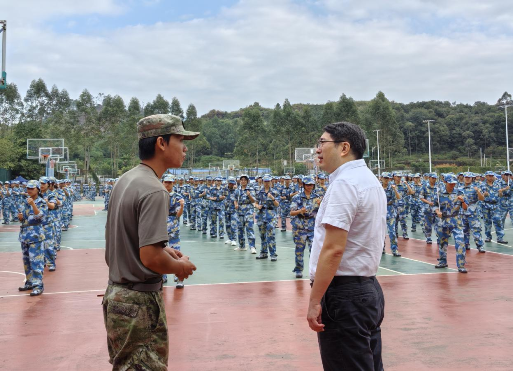 训练场上,新生军训正如火如荼地进行中,同学们精神抖擞,队伍整齐划一。郑海清一行走到学院2024级新生所在方队,了解军训工作的具体安排和目前同学们的训练进展,对同学们展现出良好的精神风貌给予了肯定;并与军训教官进行了亲切交谈,详细询问了军训的日程安排、训练强度以及新生的适应情况。他要求军训教官们要严格按照训练计划,科学施训,确保军训质量;同时,也要密切关注新生的身体状况,合理安排休息时间,确保新生们的健康安全。他希望全体新生能够以饱满的热情和昂扬的斗志投入到军训中去,通过军训磨练意志、增强体质、提升素质,为今后的学习和生活打下坚实的基础。
