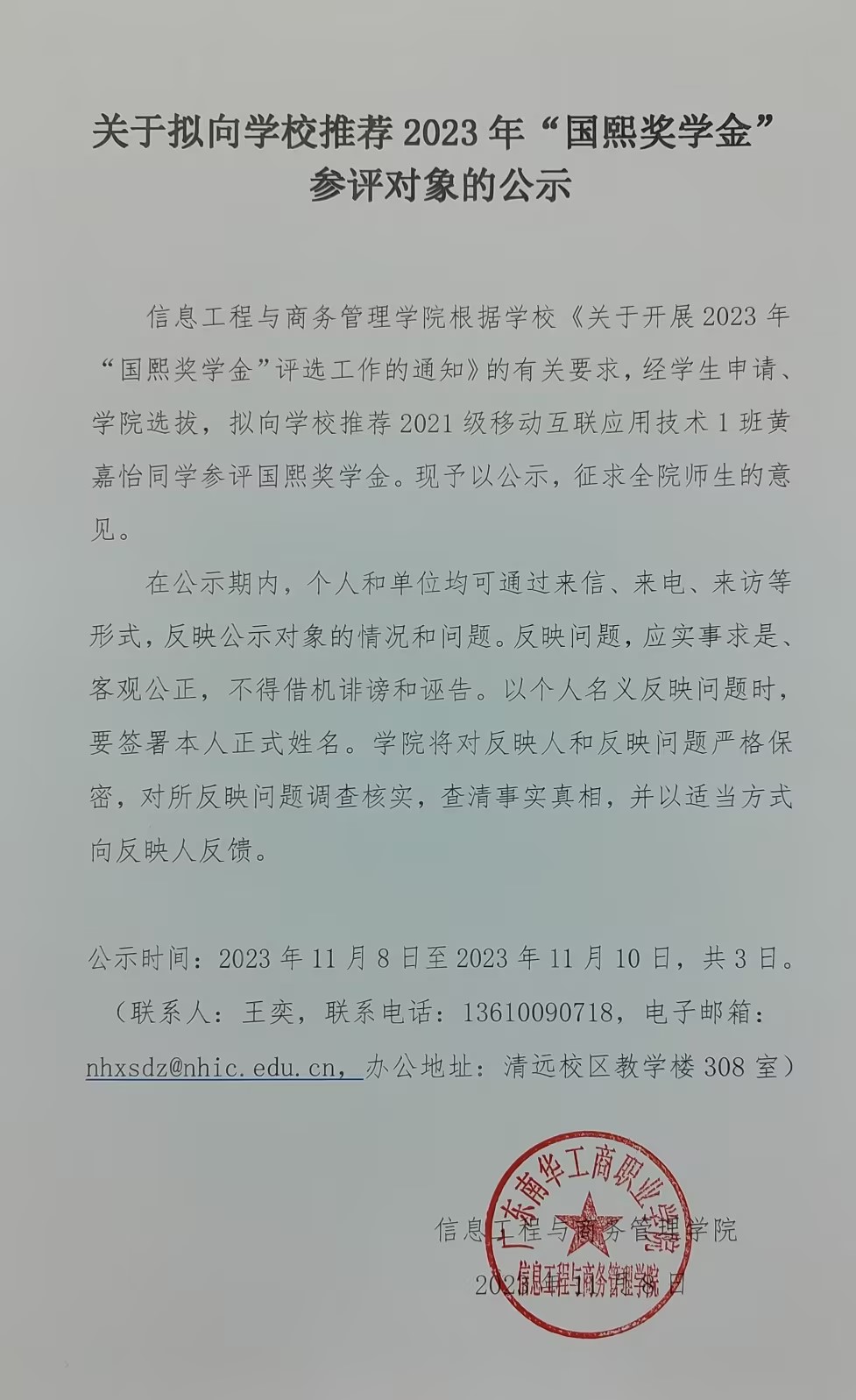 下一条: 关于2022至2023学年广东南华工商职业学院信息工程与商务管理学院国家奖学金、国家励志奖学金、国家助学金参评人的公示