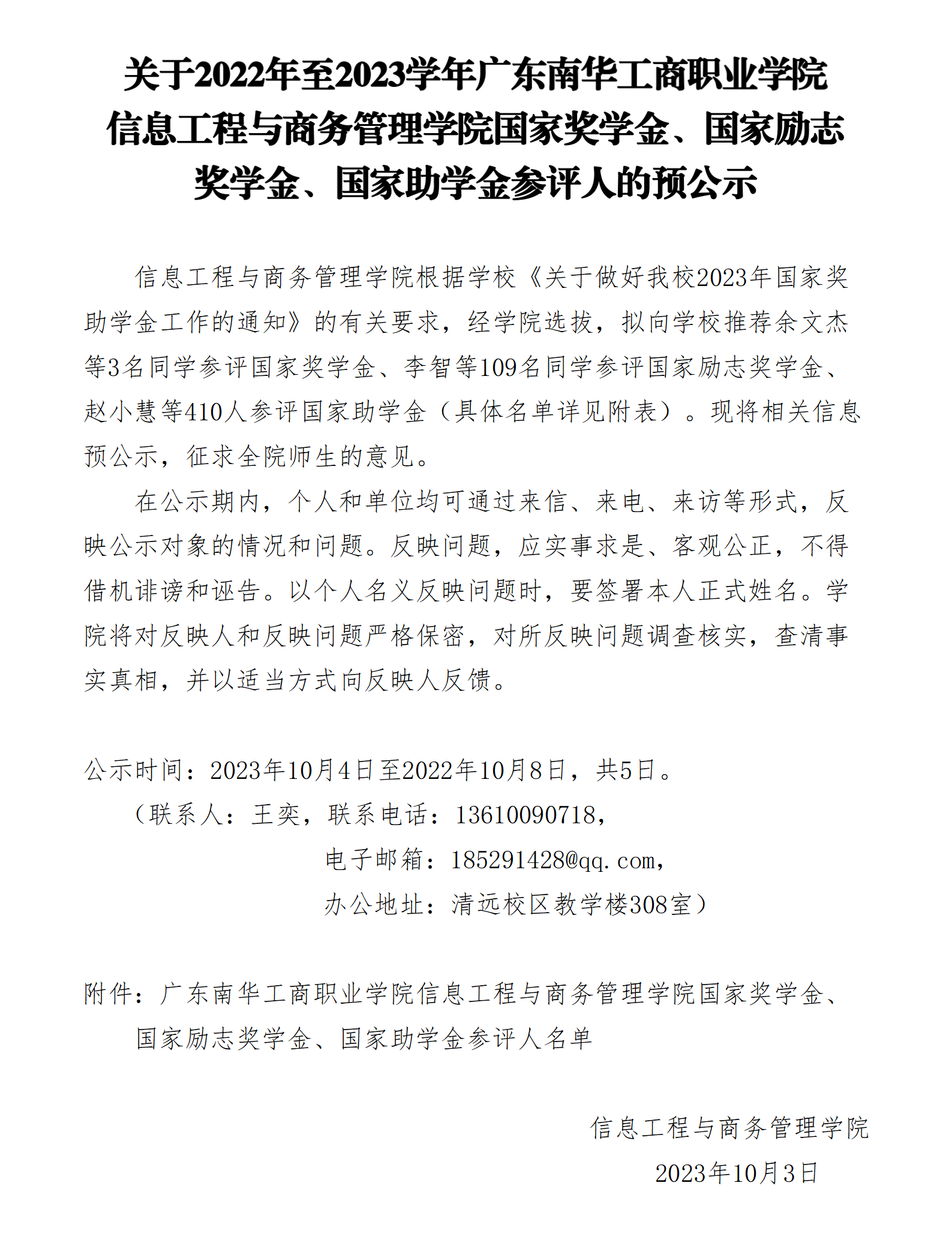 附件:广东南华工商职业学院信息工程与商务管理学院国家奖学金、国家励志奖学金、国家助学金参评人名单