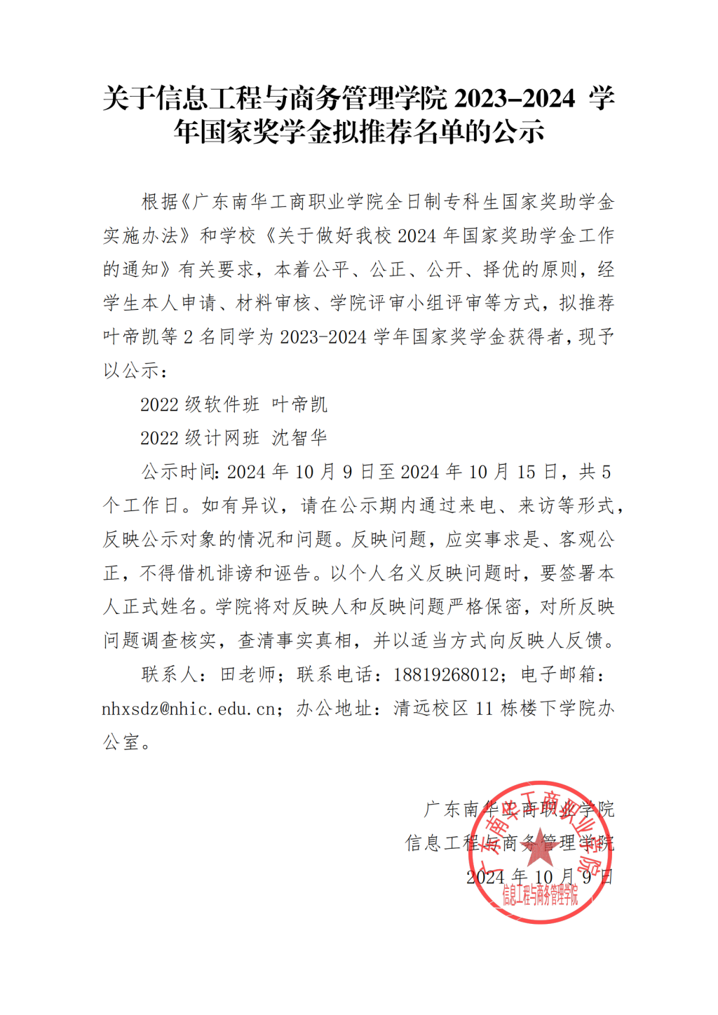 关于信息工程与商务管理学院2023-2024学年国家奖学金拟推荐名单的公示