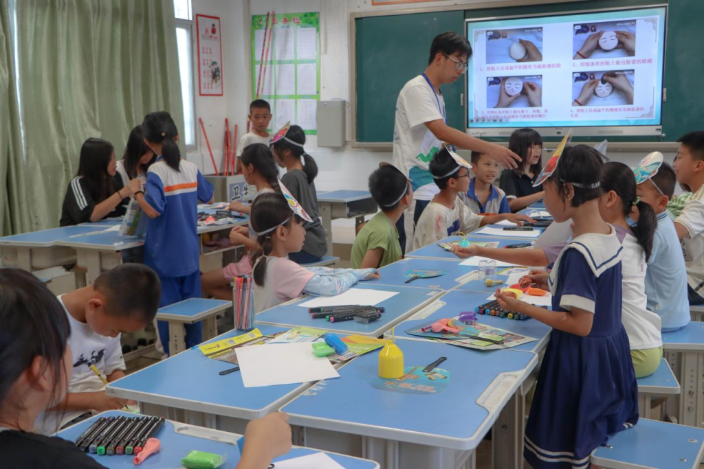 7月11日下午,为增强学生们的手工创作技能并激发他们的创造潜能,红心实践服务队设计了涵盖“感受空气科学课”“国粹脸谱”2个不同领域的实操课程。在课程中,红心实践队的支教组成员陈润琪采用现场教学现场制作的方法,带领同学们直观地感受了空气的存在,使得复杂的知识变得易于理解。另一位成员张靖林则聚焦于脸谱的创意绘画,不仅介绍了国粹脸谱的由来与应用场景,还以关羽脸谱为例,逐步演示了如何利用黏土进行创作,鼓励学生们充分发挥想象力,勇敢尝试。整个制作过程中,同学们热情高涨,积极参与,纷纷运用所学技巧,搭建出自己心目中的理想作品,展现了不凡的创造力与动手能力。