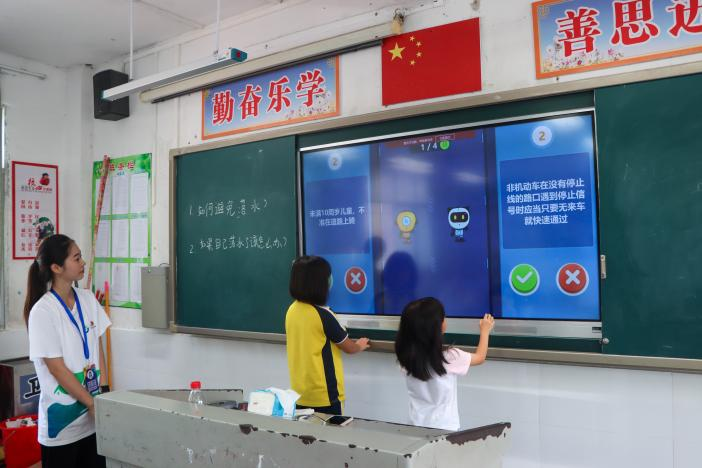 7月11日上午,红心实践服务队精心策划了4个支教课程,分别是“防溺水安全教育”“一盔一带,安全常在”“感受中国科技的神奇”“安全自卫我知道”。其中,支教组成员陈润琪设计了“安全自护跳棋”游戏,寓教于乐,既巩固了学员们的课堂知识,又锻炼了他们的思维能力。另一方面,支教组成员刘雨菡和郭清秀巧妙运用短视频展示与有奖竞答的形式,让学员们深入学习了溺水危害、预防措施、自救与互救技能,同时领略了中国科技的魅力,并强化了头盔佩戴与安全带使用重要性。这些活动不仅极大地拓宽了同学们的视野,还显著增强了他们的国家自豪感与自我保护能力,深刻传达了安全教育的核心价值。