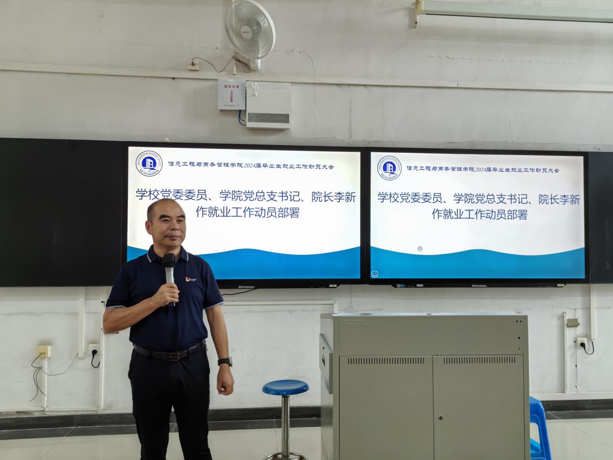 5月17日,信息工程与商务管理学院(以下简称“信商学院”)召开2024届毕业生就业工作动员大会,学校党委委员、学院党总支部书记、院长李新作动员讲话,党总支常务副书记郑海清主持会议。