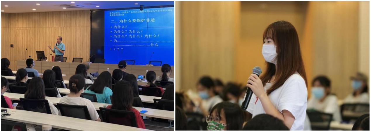 宣讲活动中,郑主任以“什么是非遗”、“为什么要保护非遗”等问题,向我们讲解了非物质文化遗产的保护与创新的必要性,接着再以清远第一届大学生非遗文创设计大赛的获奖作品为例,向同学们展示了如何以创新设计,结合清远市非遗项目,助力清远非遗文创品牌的建立。活动最后,郑主任向同学们答疑解惑有关非遗设计的相关内容,全体师生受益匪浅。