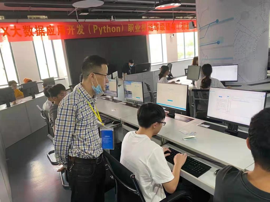 由于本次考试是大数据应用开发(Python)职业技能等级证书全国首场考试,泰迪公司积极委派了1+X项目部总监郭青山,1+X项目部产品经理王威翔协助学校进行考场布置、物料准备、设备调试等工作。