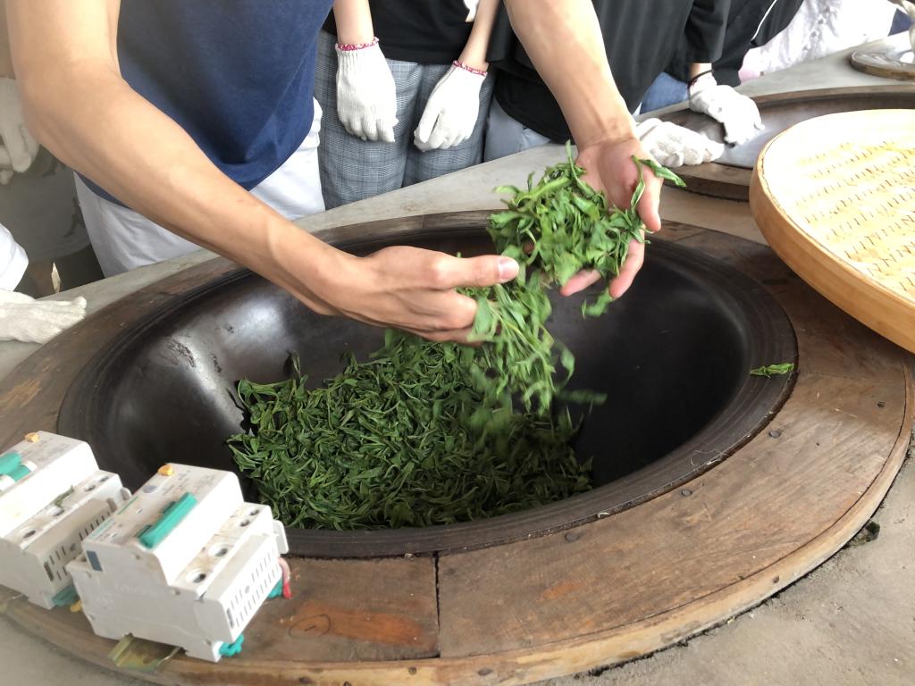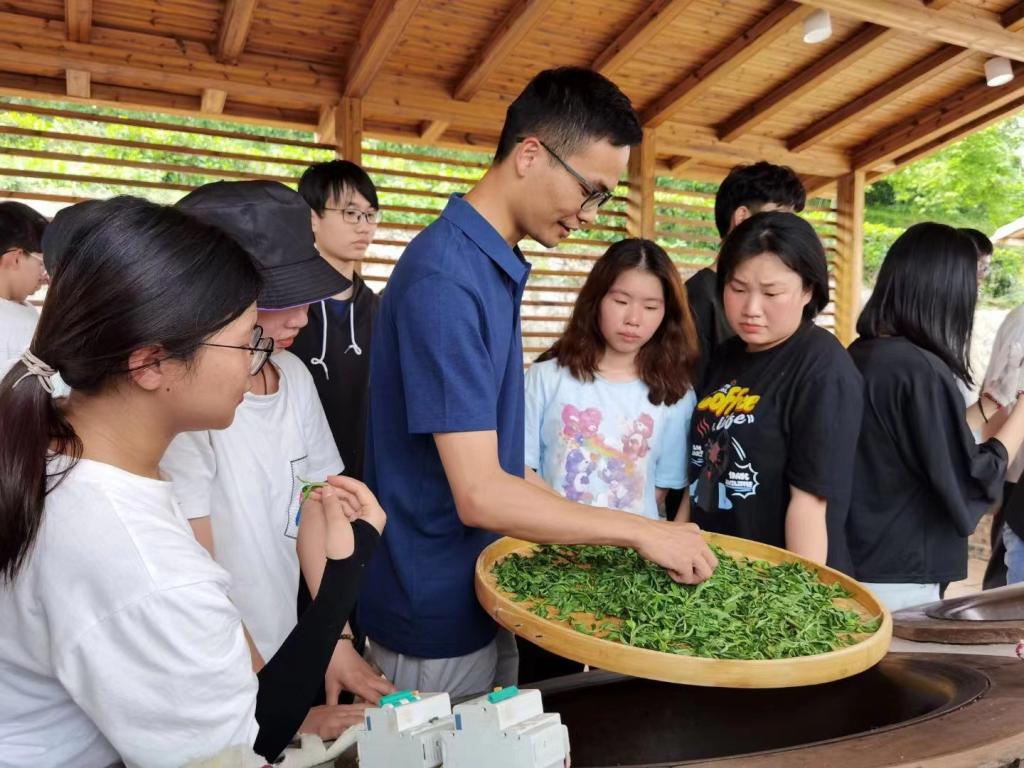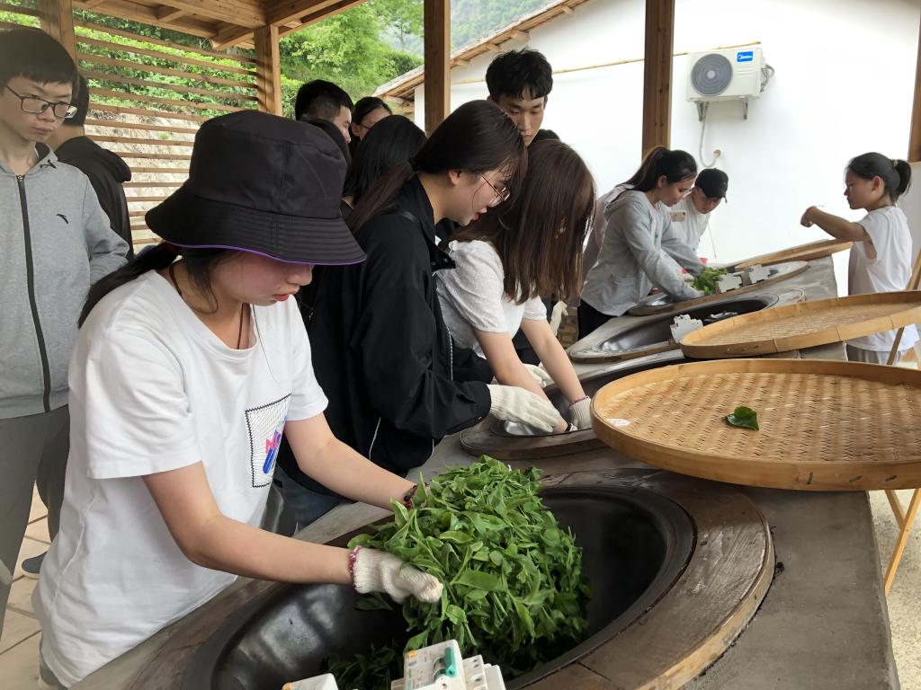 “纸上得来终觉浅,绝知此事要躬行”,要透彻地认识茶叶还必须亲自实践,通过亲手制作手工茶,才能真正感受到茶文化的奥妙。全体学生在制茶间进行制茶见习,采取先指导,后参与模式,讲解员和指导老师全程给学生介绍了制茶的具体流程,详细介绍不同的茶,不同的制作过程,然后学生参与杀青、揉捻等制茶流程,亲身体会制茶过程,体会其中的细节,体验《茶艺加工技术》课程的内容。实践环节是理论教学环节的延展途径,亲自参与更是学生喜闻乐见的方式,通过集体劳动厚植学生劳动情怀和知礼、明礼意识,在这里感受茶礼与中国礼仪的一脉相承,领略茶文化礼仪美德。