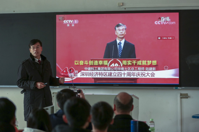 为深入落实学校“劳模工匠进校园”活动,深化我院“德育导师”育人实效,2020年12月19日下午1点45分,信息工程与商务管理学院(下称:信商学院)20级各班顺利举行“我与德育导师面对面”主题班会活动,本次主题班会分为:嘉宾介绍、主题分享、学生感悟、交流互动、合影留念几个环节。广东南华工商职业学院党委书记、校长马栩生,中建钢构有限公司项目经理陆建新等13位劳模工匠,信商学院党总支书记、院长李新,信商学院党总支常务副书记郑海清及信商学院26个新生班级一千余名师生参加了本次主题班会活动。