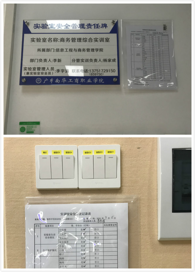 为加强实训室安全管理,保障实验实训教学工作的顺利进行,保护师生的生命安全。9月30日上午,信息工程与商务管理学院院长、书记李新、常务副院长肖伟、副院长杨家成、实训室管理员李宇清一行对学院清远校区20间实训室进行现场检查,重点检查各实训室卫生环境、水电安全管理、消防安全、仪器设备使用管理及实训资产管理情况等。学院院长、书记李新与学校签订了《2020年广东南华工商职业学院实验室安全工作责任书》。