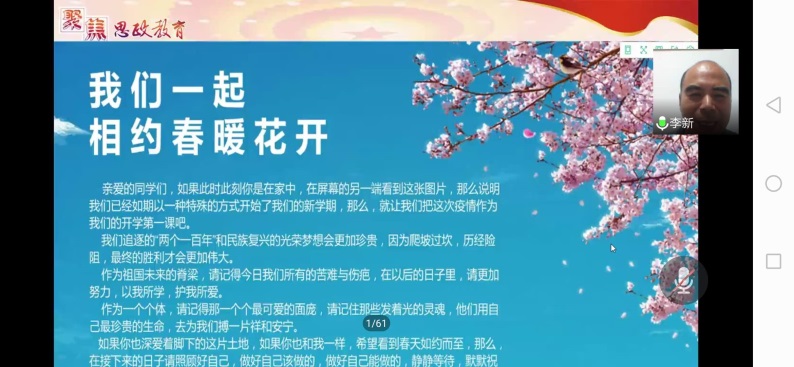 最后,李新书记通过对积极抗“疫”、坚持学习的所有同学表示肯定并提出希望,他勉励广大同学:“要把此次疫情作为开学的第一堂课,通过克服困难不断追逐“两个一百年”和“民族复兴”的光荣梦想。作为祖国的脊梁,在记得困难和伤疤的同时,要更加努力以自己的学识保护自己所爱的人,作为个体要记住那些用自己的生命换回祥和安宁发光的灵魂。”他在最后督促所有的同学们都要在疫情防控实践中增强责任担当、学会健康成长。
