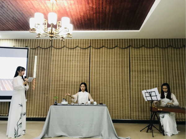 在大会主持人卢海花致开场词,并介绍出席活动的领导、老师和嘉宾之后,来自茶室茶道艺术团的黄静媚、李雅雯和王艾熙同学为大家带来《但愿人长久》茶艺表演。表演完毕后,紧接着又观看茶室这一年的活动回忆视频—《青春纪念册》,在满怀对昔日点滴相处的怀念中,大会正式拉开序幕。