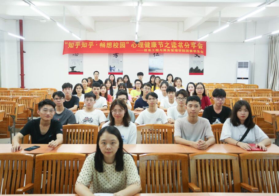 为进一步普及大学生心理健康知识,增强大学生心理适应能力和问题应对能力,信商学院于2019年6月20日晚上19:00在教学楼320开展了以“知乎知乎·畅想校园”为主题的心理健康节之心理读书分享会。本次活动由学生工作处主办、信商学院承办。信商学院龙俏颖老师参加本次活动。