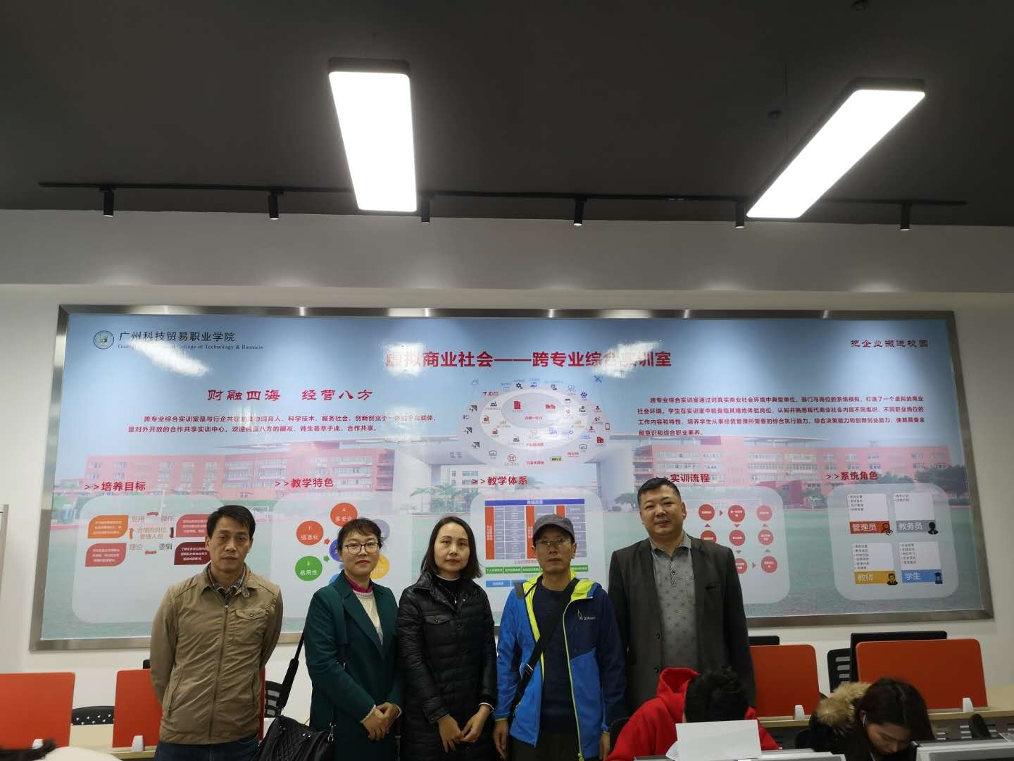 广州科贸职业技术学院创新创业的相关指导老师和用友企业指导老师接待了我们的考察。根据介绍新道VBSE综合实践教学软件平台为用友集团基于线上线下新商科理念开发,是个大型高度全仿真教学软件,最多可以容纳240名学生同时教学,形成微型而又全面的社会商业体系。构建集市场环境、商务环境、政务环境和公共服务环境为一体的虚拟商业社会环境, 学生置身其中进行岗位分工、角色扮演、业务演练,根据现实岗位工作内容、业务流程、业务单据,结合与教学目标适配的业务规则,将经营模拟与现实工作接轨,进行仿真经营和业务运作,可进行宏观微观管理、多人协同模拟经营,充分体验产业经济环境下组织间的分工、协同与发展,培养其在现代商业社会中从事经济活动所需的职业素养、经营决策能力和创新创业能力,是一个可以满足经管类多专业学习与实践的综合实践教学平台。所以与常见的技能型教学软件不同的是,该软件覆盖制造业企业运作,供应链的上游工贸组织,供应链的下游商贸组织和社会协同包括银行、工商局、税务局、支付系统,形成企业模拟,商业模拟和社会协同模拟三大板块,板块之间不再是封闭而是能相互交融,学生通过竞聘方式当选各个组织的CEO,再由CEO通过社会招聘方式形成自己的创业团队,协同争取工贸组织订单,开拓销售渠道向商贸组织里不同的经销商进行竟售,同时与银行、工商局、税务局,出口等发生业务往来。