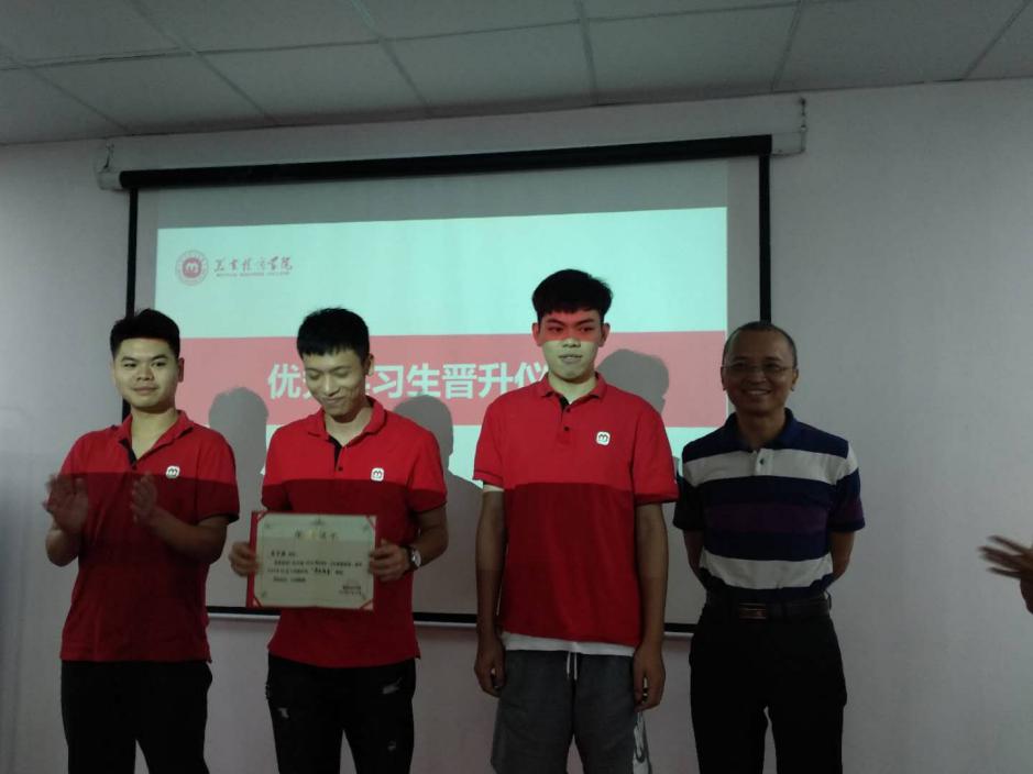开班仪式汇集了在广州大区参加“信商学院-美宜佳协同育人创新创业班”的26位同学,在肖院长,李丰涛总监的发言之后,主持人杨斌对美宜佳的发展历史做了介绍,重点介绍美宜佳独特的“英国学徒制”培养方法,并现场邀请学生进行培养展示,对课堂教学有很强的的启发意义,接着进行美宜佳独有的开班拜师仪式,整个氛围严肃又活泼,朝气蓬勃,让人感受美宜佳的独特企业文化。让人感到骄傲和欣慰的是这次参加“信商学院-美宜佳协同育人创新创业班”的同学里有三位同学在短短的三个月工作中凭着积极努力晋升了职位,展示了我院学生的良好精神风貌。