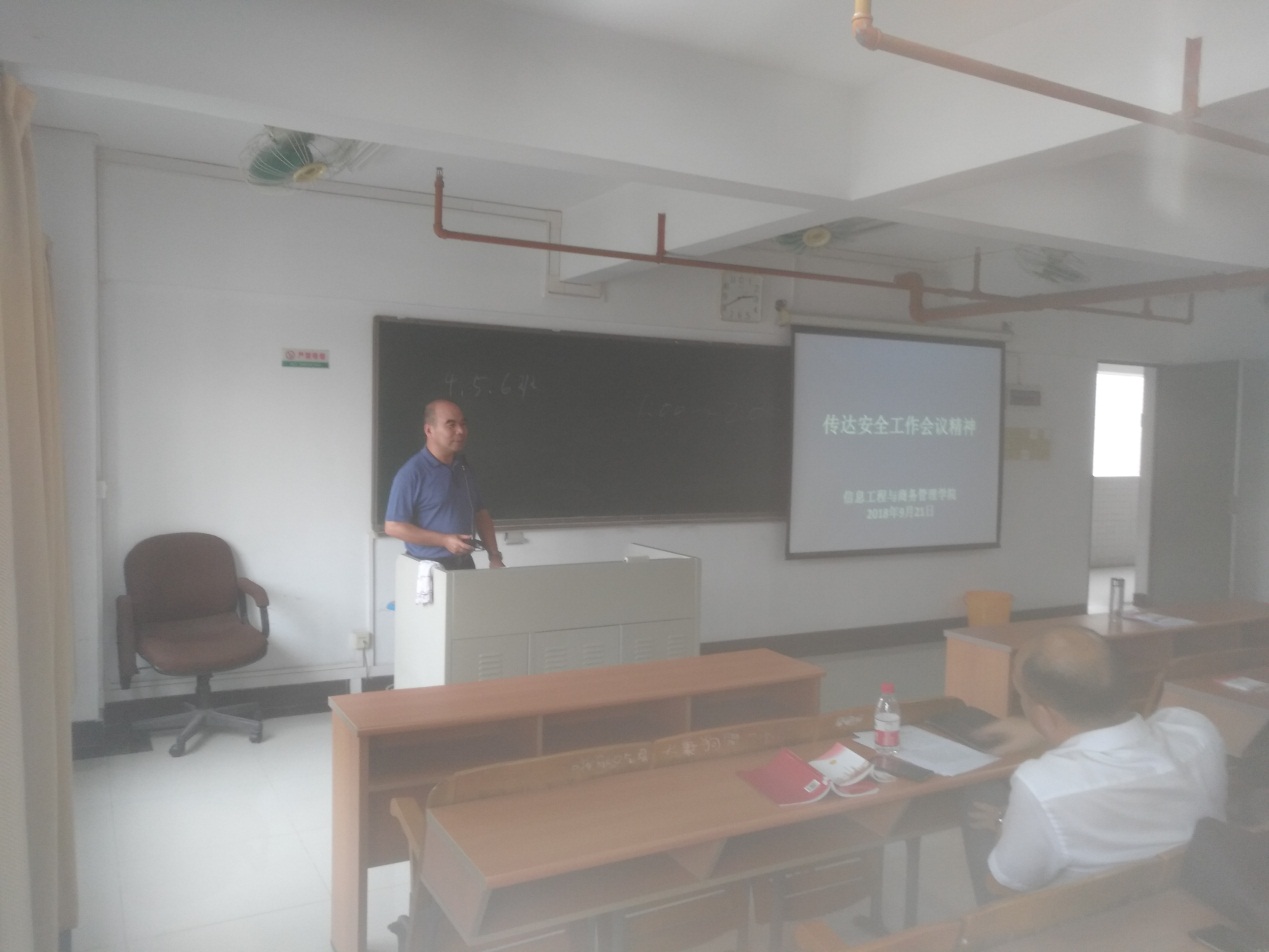 会议分三个议程。首先由李新院长传达了学校安全工作会议的重要精神。李院长传达了广东省教育厅《关于做好中秋节、国庆节期间安全稳定工作的提醒函》文件精神和通报了学校上半年的一些案件情况。其中较为突出的问题主要有学生网络借贷和意识形态安全问题等,要求全院教师共同做好相关的防护工作。