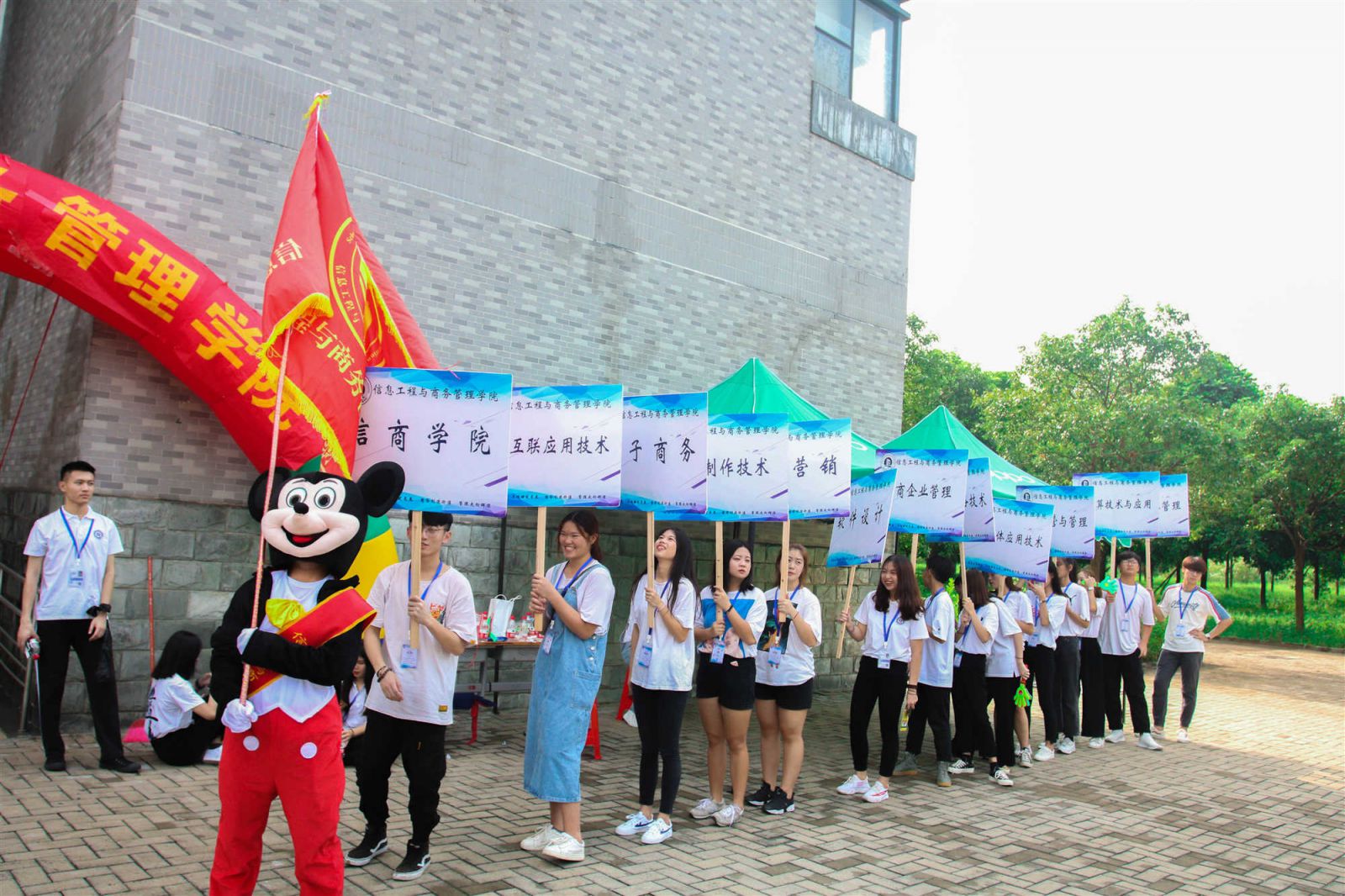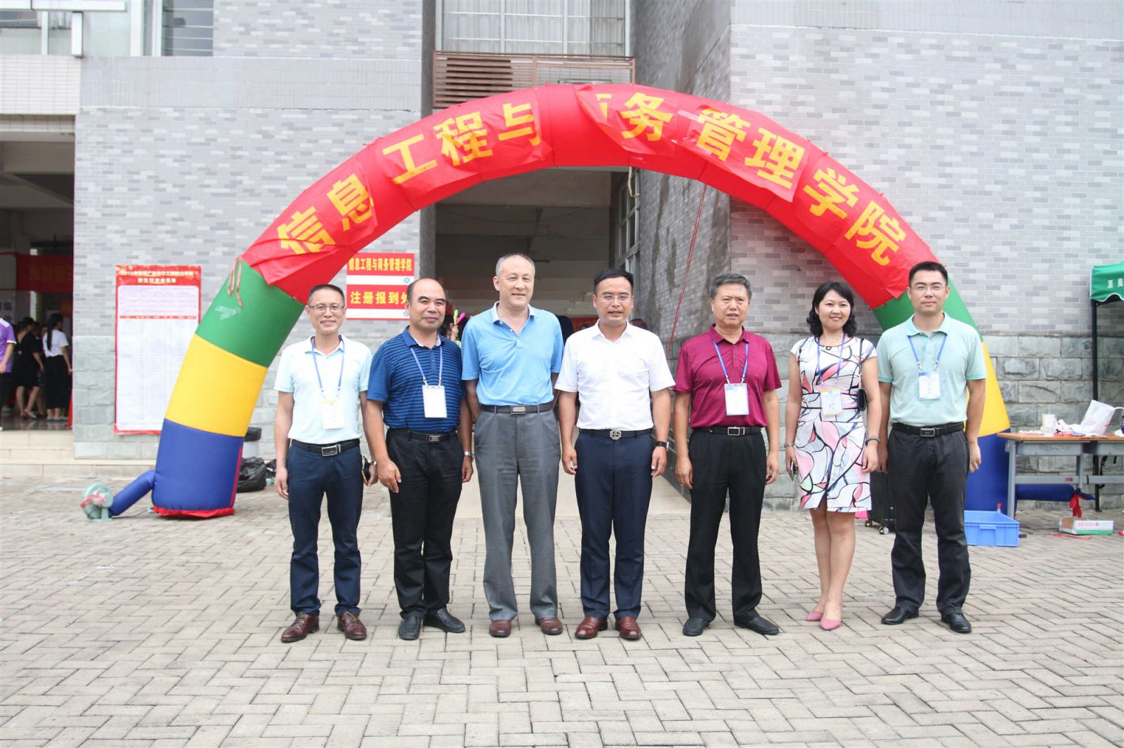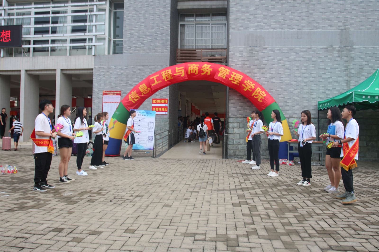金秋九月,清风徐徐。又是一年开学时,信息工程与商务管理学院迎来了2018级青春洋溢的新同学。9月7日上午6:20,信商学院团委学生会各部门干部、迎新志愿者以及新生班导齐聚教学楼一楼架空层布置迎新会场。七时整,信息工程与商务管理学院迎新工作全面启动,为确保迎新工作的顺利开展,信商学院党总支书记、院长李新、常务副院长肖伟、党总支副书记凌红、副院长刘杰、副院长杨家成以及信商学院二十多名老师全天候坐镇指导。