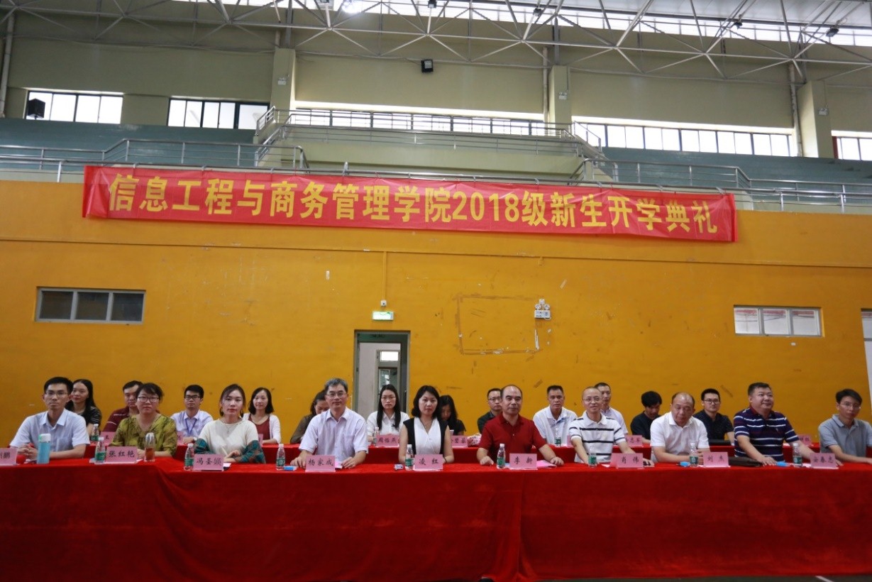 9月8日上午九点三十分,信息工程与商务管理学院2018级开学典礼在清远校区体育馆隆重举行。信商学院党总支书记、院长李新、常务副院长肖伟、党总支副书记凌红、副院长刘杰、副院长杨家成、信商学院各系系主任暨各专业负责人出席了典礼,学院2018级全体新生及全体新生辅导员参加了典礼。典礼由学院办公室主任邱州鹏主持。