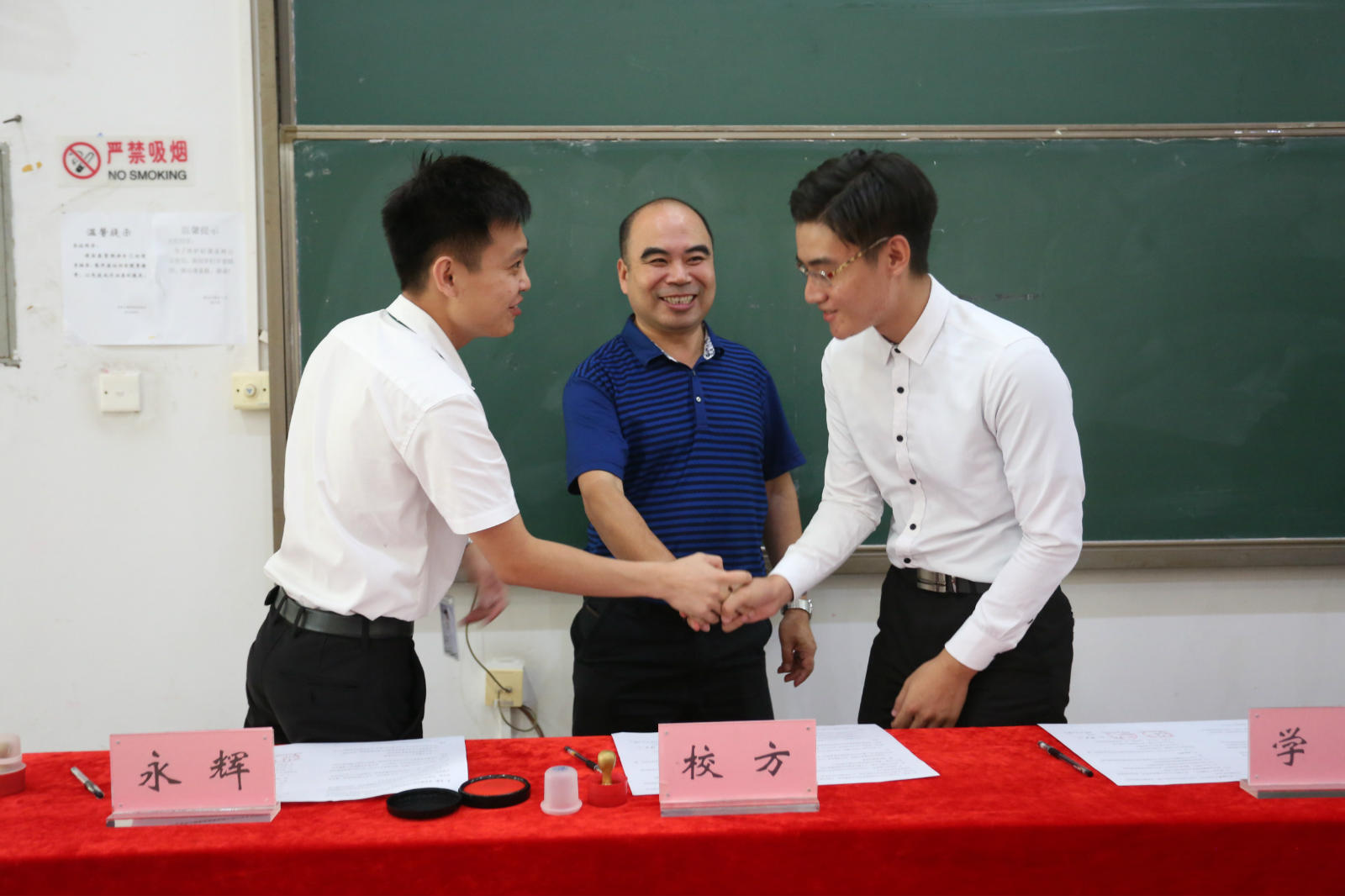 李新院长、永辉超市有限公司代表吴树安经理、学生代表陈良川三方协议签订