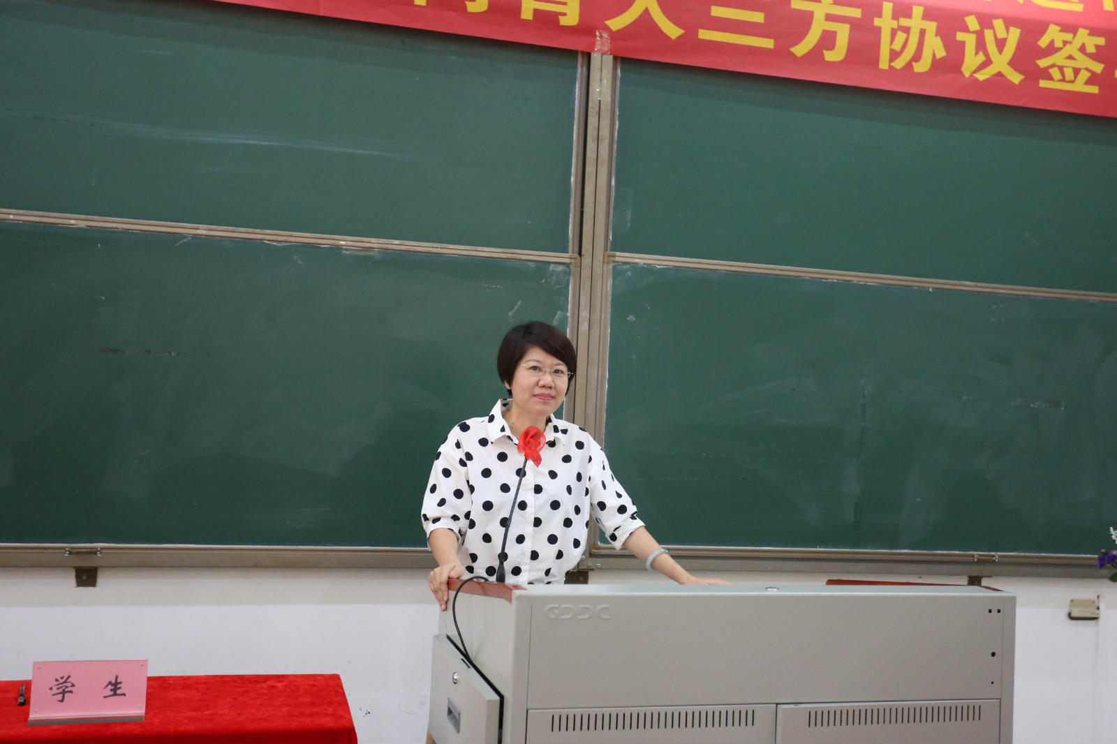 签字仪式完毕,由工商企业管理专业负责人饶妍红老师作实习动员,饶妍红老师希望同学们把学习放在第一位,从企业里、同事里、领导里学习一线经营知识;还要开始学做职业人,处理好职业关系,承担职业责任,并祝福同学们成为南华的骄傲、企业的骄傲。