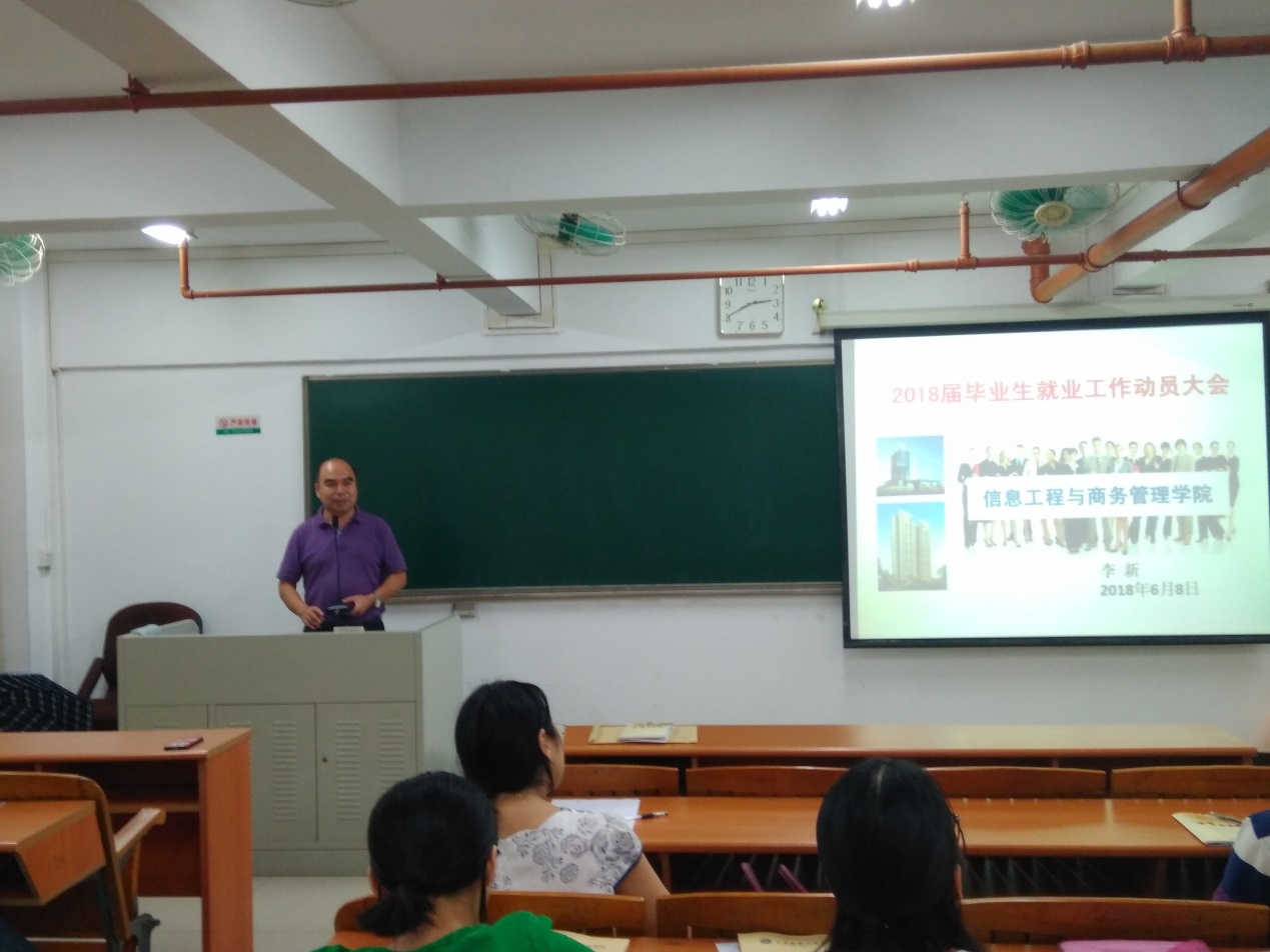 会议第一项议程,由信商学院李新院长就“2018届毕业生就业工作”作动员。李新院长强调:1.在就业工作中要注意创新强校的三个指标:“初次就业率”、“专业对口率”、“平均薪资”;2.全体老师要参与到毕业生的就业工作中来;3.注意6月20日、7月20日、8月10日这三个重要节点,要提醒、引导学生在就业系统上填报或更新就业数据;4.带班辅导员要注意引导学生尽快就业。