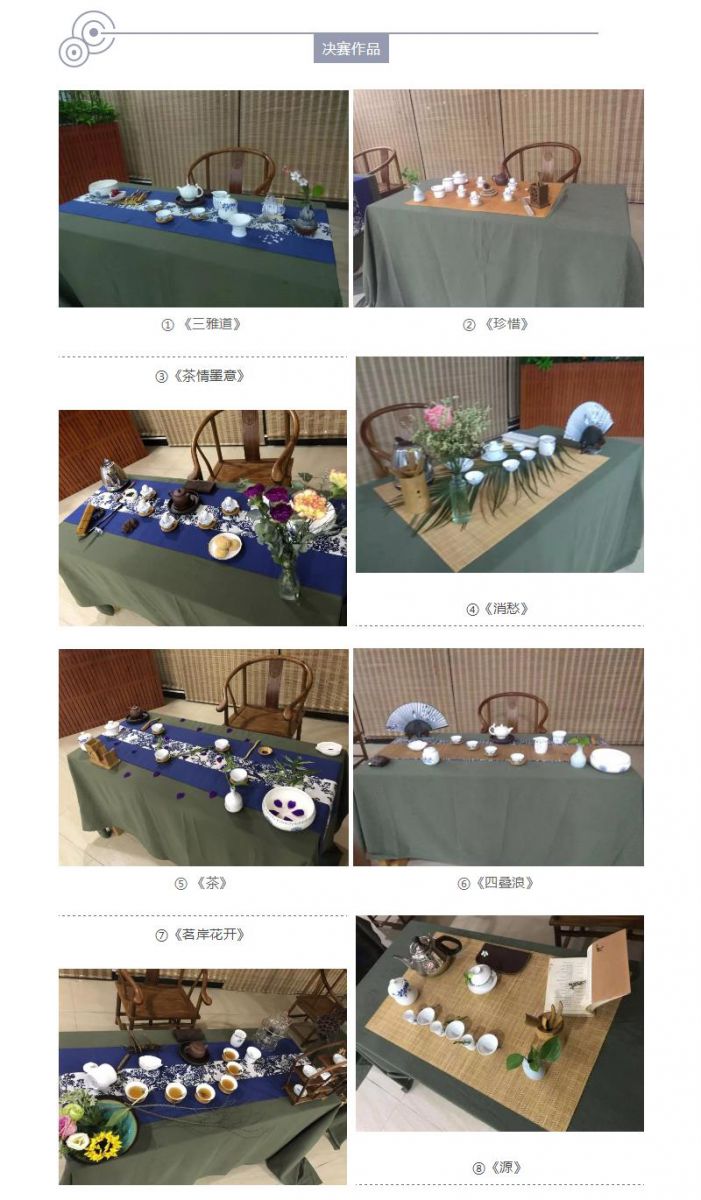 本次比赛共收到14份作品,经过初赛的比拼,共有8支队伍进入决赛。决赛作品以现场布席形式进行,参赛选手现场挑选用具,大胆创作,别出风格。布席结束后,现场进行解说,阐述作品的设计理念、创作思路。评委老师从茶席设计、主题设计、整体协调、仪容仪表等方面进行打分。