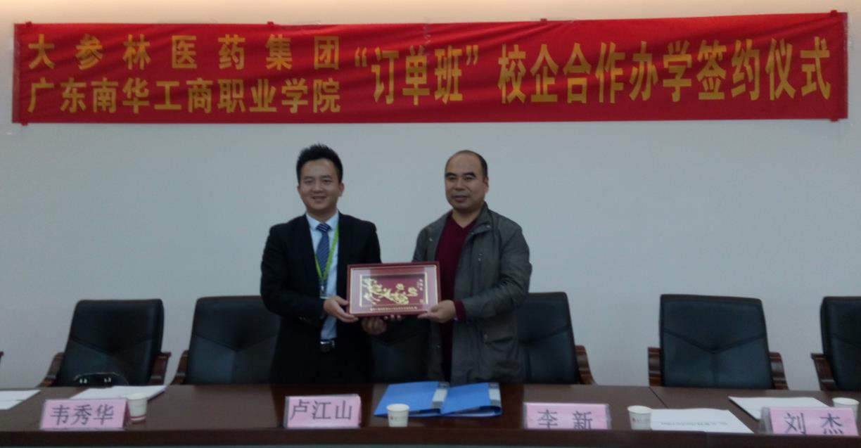 仪式的第二个环节是李新院长和卢江山总监的正式签约,两人在合同上郑重地签上一笔,同时也代表着我院专业建设工作的进一步推进。随后,两人代表企业和学校互赠礼品和锦旗,更促进校企的良好合作和发展。仪式的最后一个环节,是校企代表李新院长和卢江山总监共同为“大参林医药集团有限公司教学实习基地”揭牌,也为此次校企合作办学签约仪式落下完美帷幕。