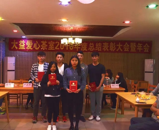 紧接着,结合全体成员的考勤情况及参与茶室工作的情况,评选了2016年12月大益爱心茶室“服务之星”、2016年度大益爱心茶室“优秀员工”。由店长为获得12月“服务之星”的陈良川、吴锦爱、王景灏三个同学及2016年度“优秀员工”的陈小营、刘嘉鑫两位同学颁发荣誉证书。
