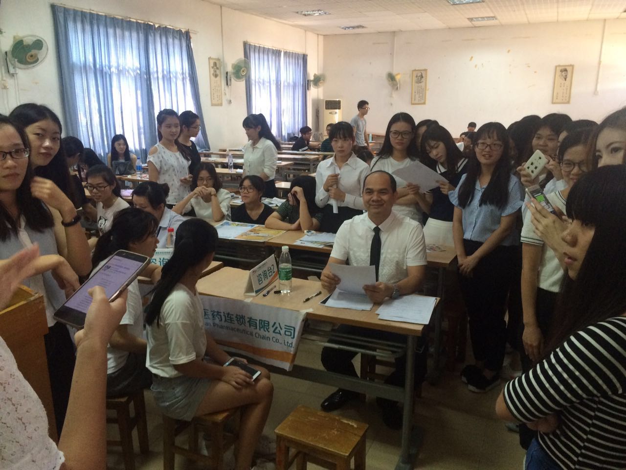 2016年9月27日,一个秋高气爽的日子,广东邦健医药连锁有限公司在我院黄埔校区8栋101教室进行现场宣讲和招聘。此次招聘对象为我系2014级医药营销、药品经营与管理和公共营养师班的学生,招聘岗位为顶岗实习、储备干部等职位。胡元利老师、蒋丽芸老师参加了招聘会。