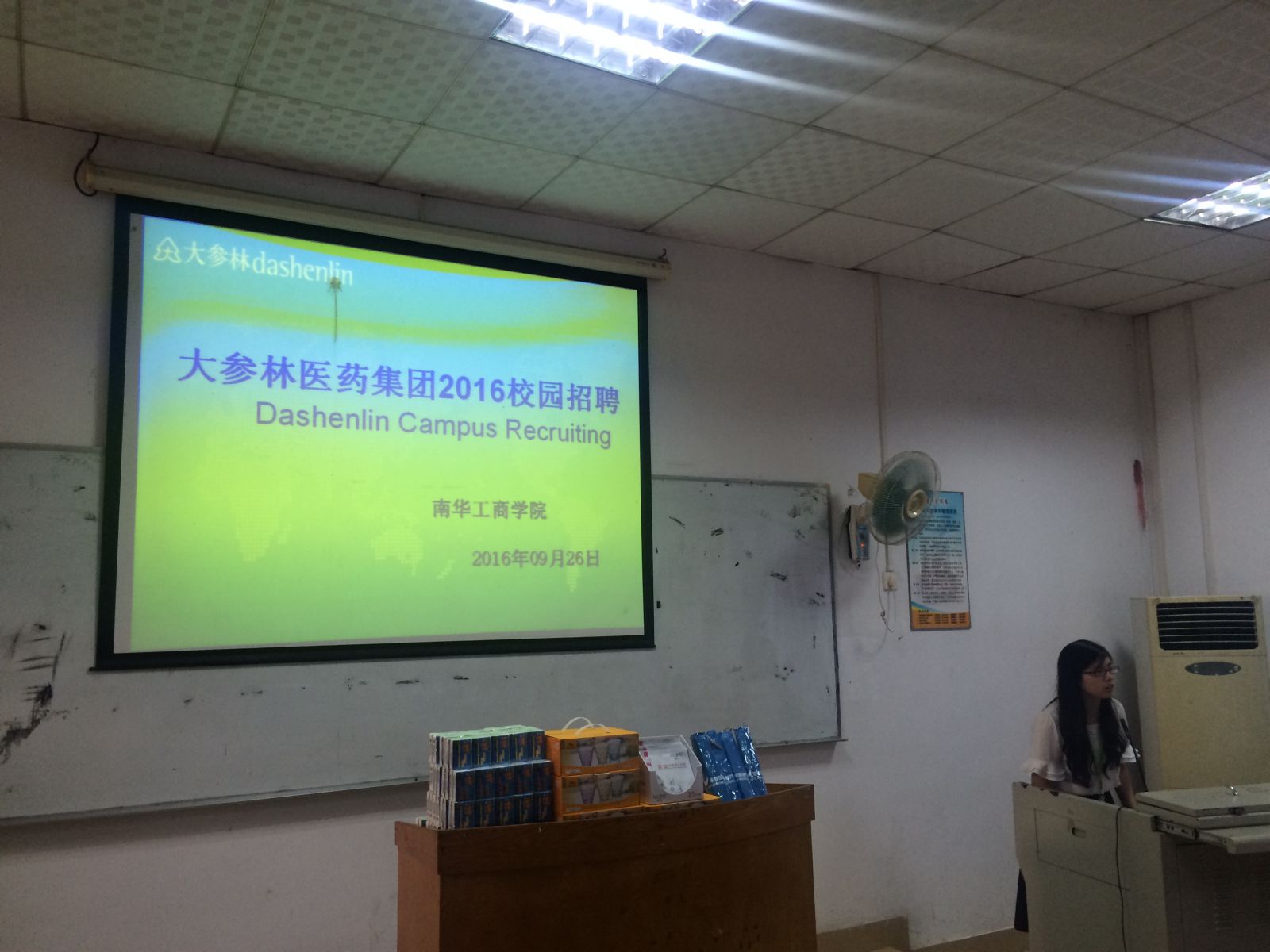2016年9月26日下午,大森林医药集团在我校黄埔校区8栋101教室进行现场宣讲和招聘。此次招聘对象为我系2014级医药营销、药品经营与管理和公共营养师的学生,招聘岗位为顶岗实习。参加此次宣讲会的老师有信商学院药品经营与管理专业胡元利老师与蒋丽芸老师。