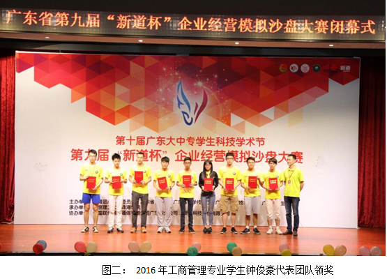2014年至2016年,信商学院工商管理专业学生参加过三届广东大中专学生学术科技节之“新道杯”企业经营沙盘模拟大赛,其中2014年和2016年都获得了二等奖。大赛采用ERP手工沙盘与新道新商战沙盘系统相结合的方式进行,以生产型企业为背景,以手工及新商战沙盘系统为平台,让每个参赛学生置身商业实战场景,实地体验商业竞争的激烈性,通过企业经营模拟沙盘的团体对抗,最后以模拟经营成果决定名次和奖项。