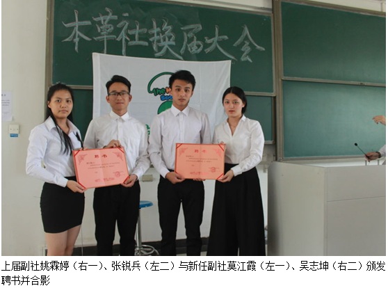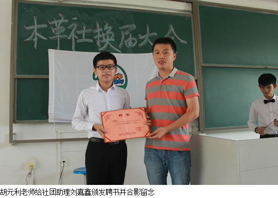 会上,指导老师胡元利肯定了上一届本草社干部的工作,并对新一届本草社干部表示热烈的祝贺。随后,上一届社长杨婷围绕上年活动做了工作总结报告,并对新一届干部给予高的期望。接着,胡元利老师及上届干部们为新任干部颁发了聘书并合影留念。新一届社长陈钰玮接过上届社长杨婷的接力棒,表示愿意与新一届干部一起为本草社的建设共同努力。最后,换届大会在热烈掌声中落下帷幕。