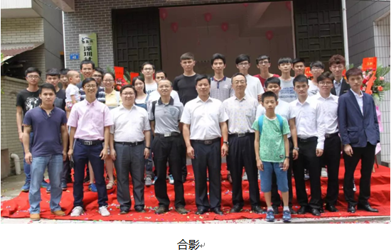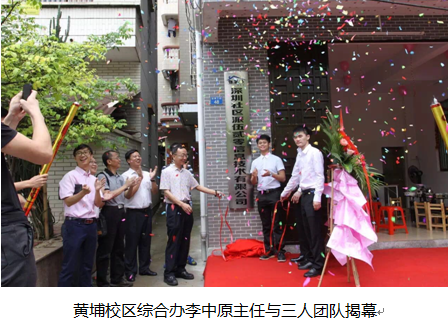 之后信商肖伟副院长上台讲话,也对他们公司成立表示热烈的祝贺,希望他们团队在后面能积极应对挑战。然后大家由就业办步行到公司,在大家的见证下,黄埔综合办李中原主任与三人团队一起揭幕并且拍照留念。